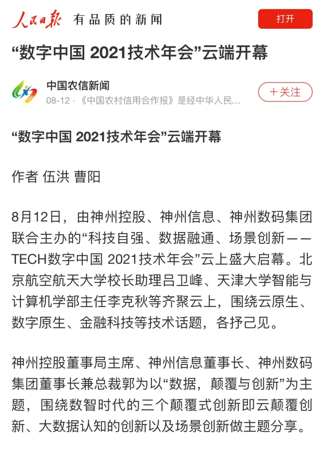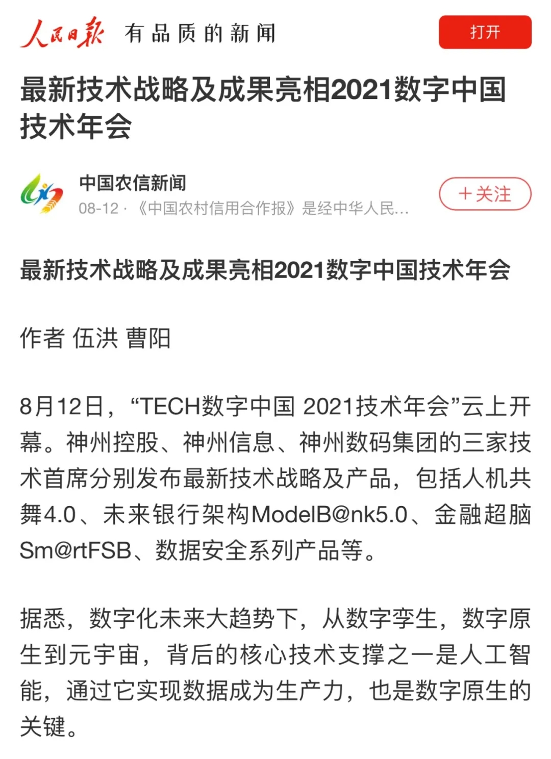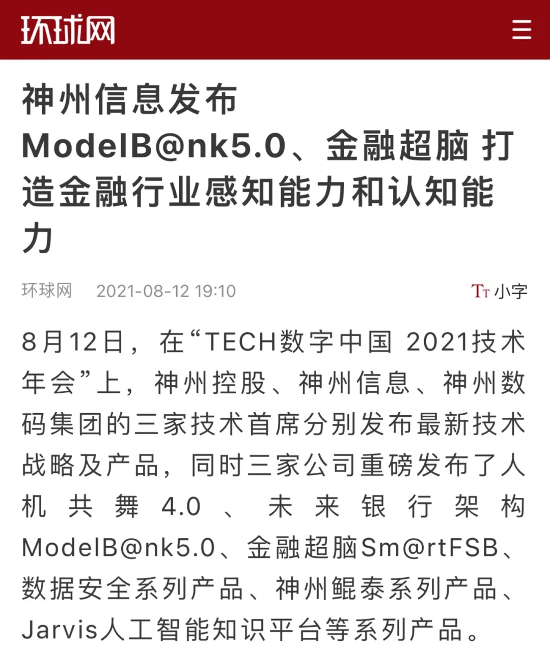 8月12日,由南宫28控股、南宫28信息、南宫28数码集团联合主办的“科技自强、数据融通、场景创新——TECH数字中国 2021技术年会”云上盛大启幕,发布南宫28信创云、ModelB@nk5.0、金融超脑Sm@rtFSB、云原生数字化安全底座、园区智能体等重磅产品,国内各大权威、影响力媒体多角度多频次对盛况进行报道!